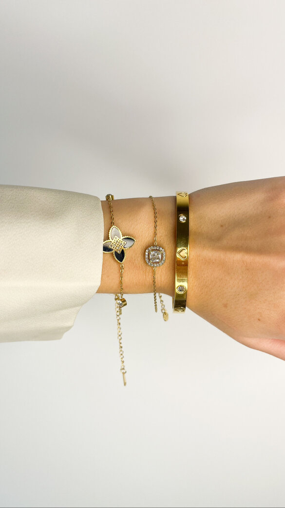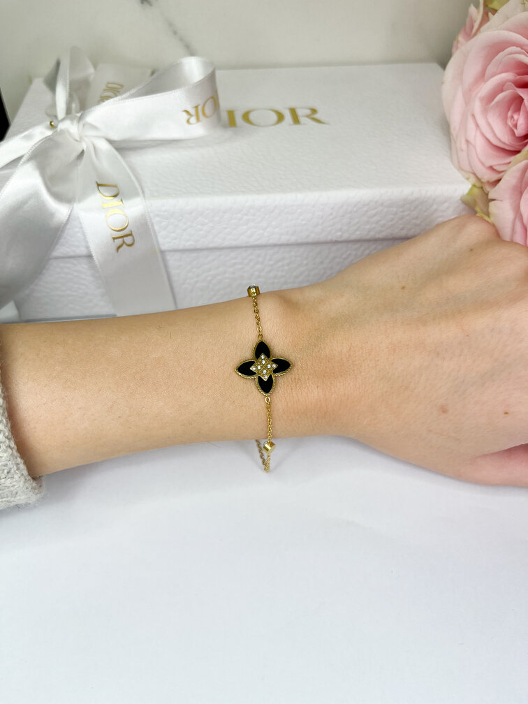 Bransoletka z motywem czarnego kwiatu wykonana jest ze stali chirurgicznej koloru złotego.