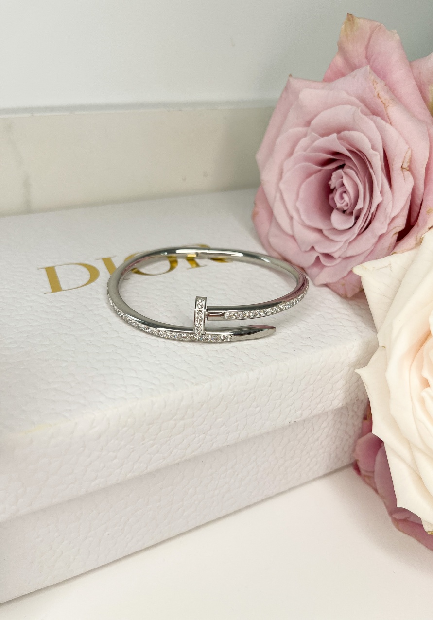 Bransoletka z motywem gwoździa w kolorze srebrnym wykonana jest ze stali chirurgicznej.