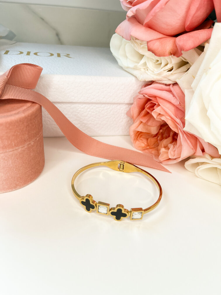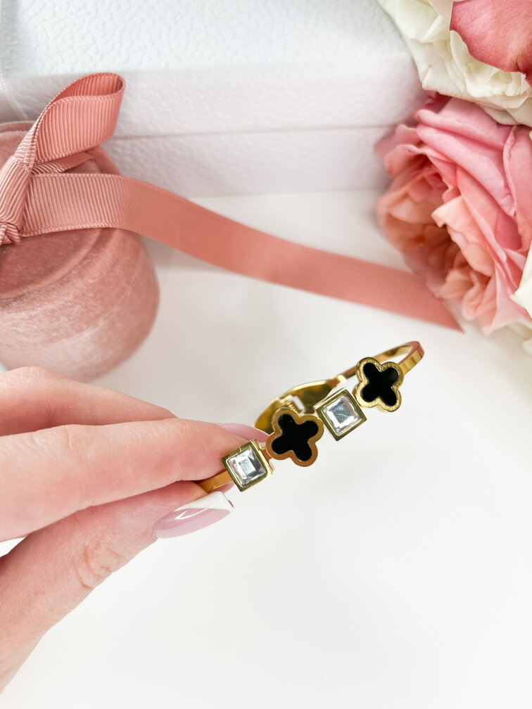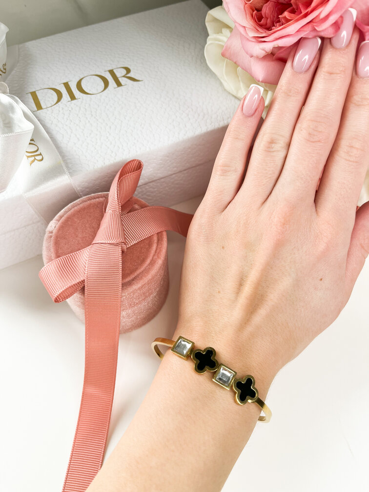 Bransoletka otoczona jest czarnymi koniczynkami oraz kwadratowymi diamencikami.