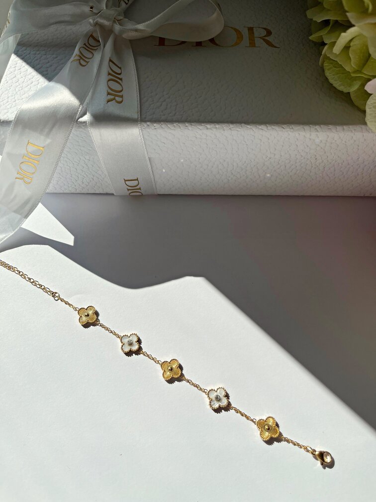 Pozłacana bransoletka ze złotymi i perłowymi kwiatami wykonana jest ze stali chirurgicznej.