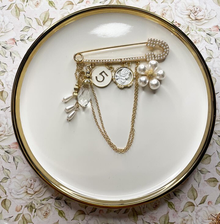 Pozłacana broszka w wiszącymi elementami.