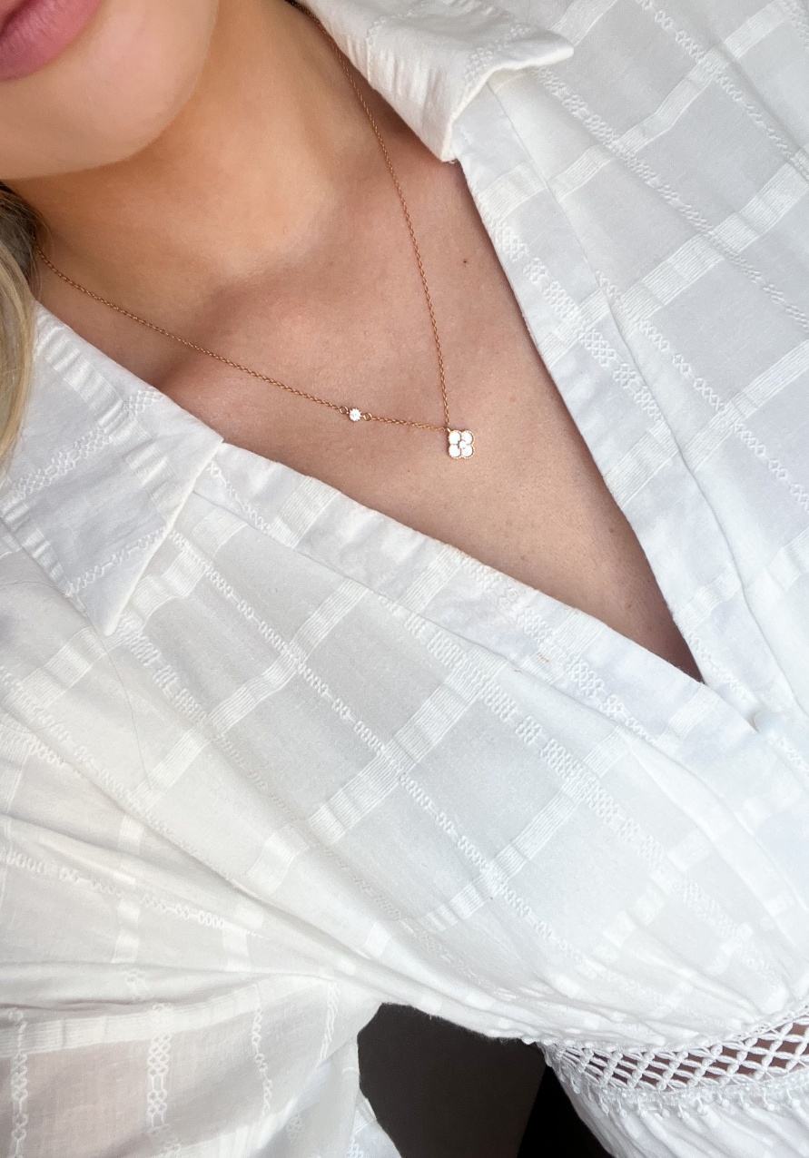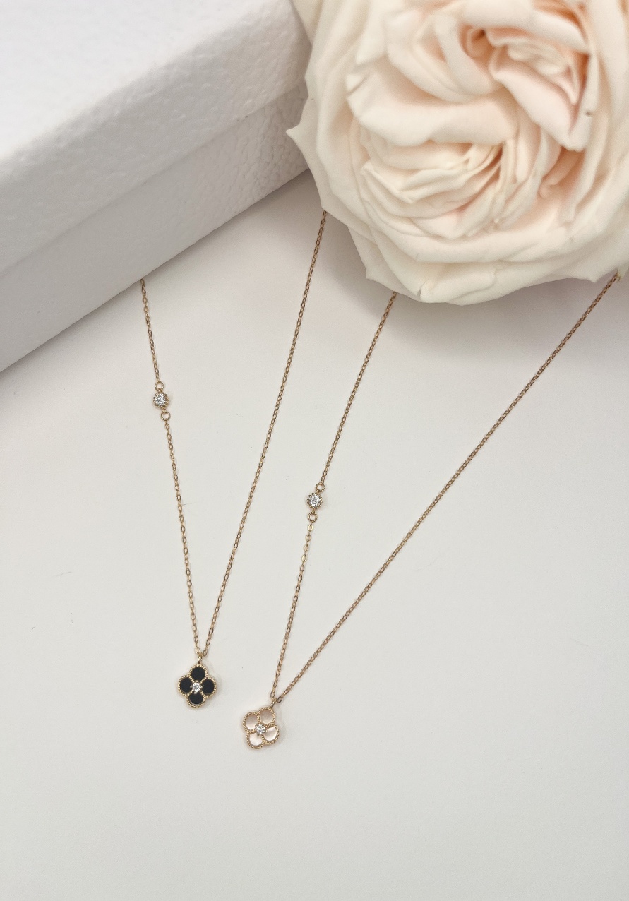 Naszyjnik zakończony małym kwiatkiem w kolorze perłowym wykonany jest ze stali chirurgicznej.
