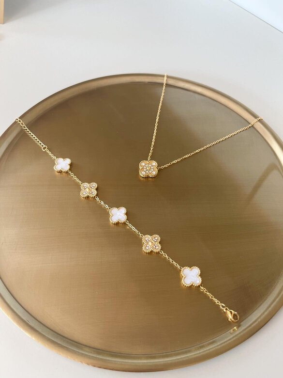 Koniczynka z jednej strony ma kolor perłowy,z drugiej zaś wypełniona jest diamencikami.