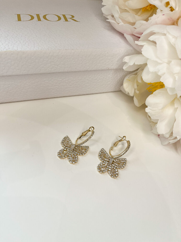 Wiszące kolczyki w kształcie motyla z diamencikami wykonane są ze stali chirurgicznej w kolorze srebrnym.