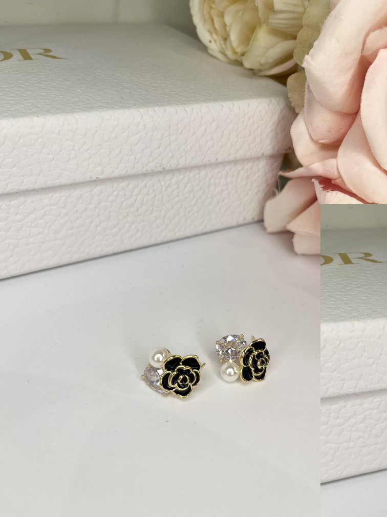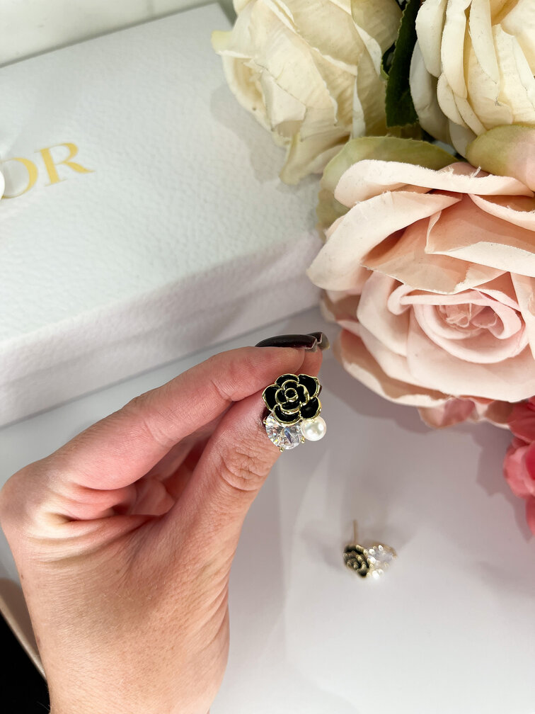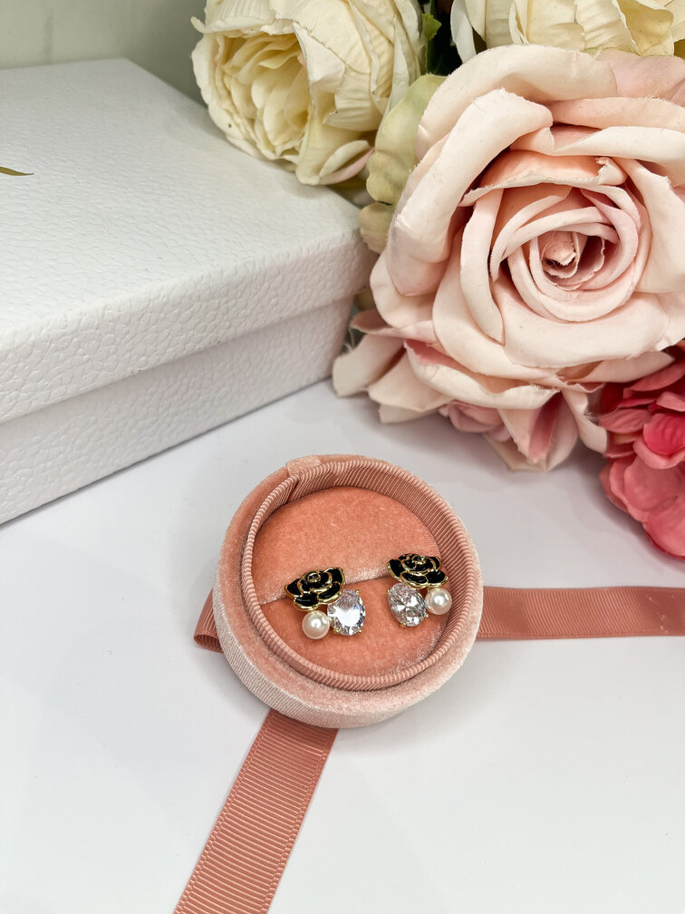 Kolczyki w kształcie róży z perłą oraz okrągłym diamencikiem wykonane są ze stali chirurgicznej.