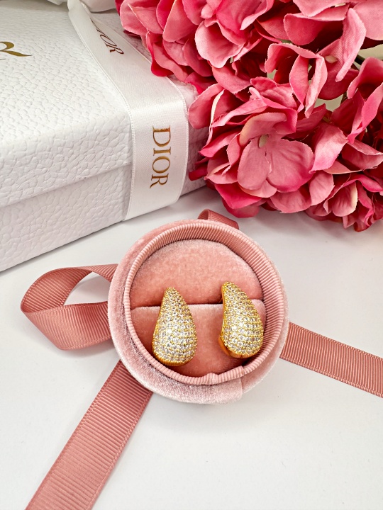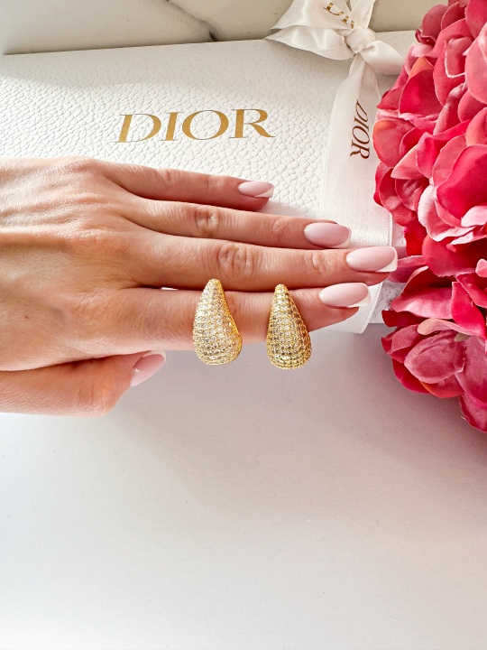 Złote kolczyki w kształcie łezki otoczone są drobnymi diamencikami również w tym samym kolorze.