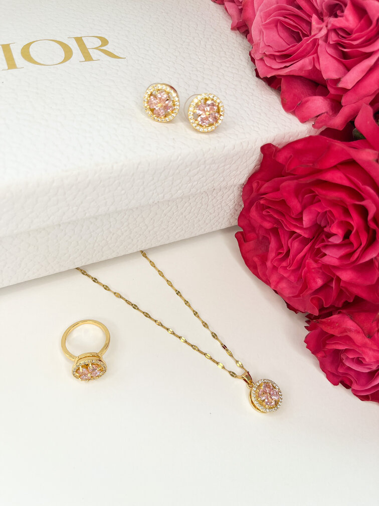 Komplet biżuterii z diamencikami i różowym kwiatkiem wykonany jest ze stali chirurgicznej.