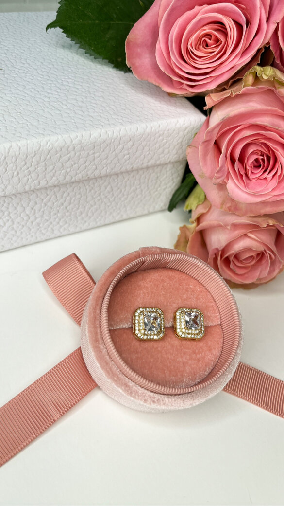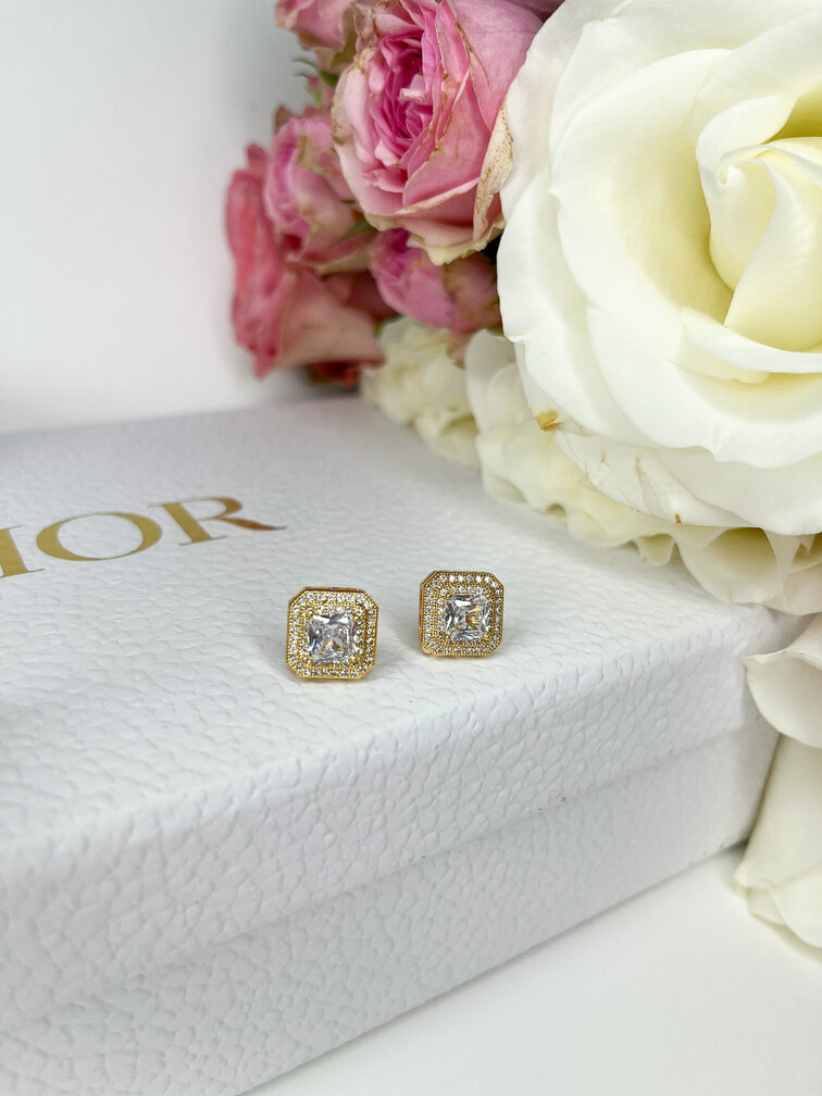 Kwadratowe kolczyki wykonane ze stali chirurgicznej w kolorze złotym.