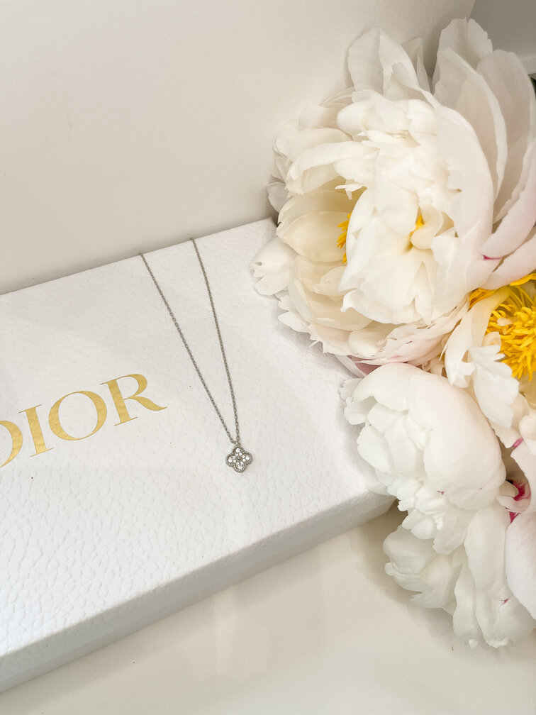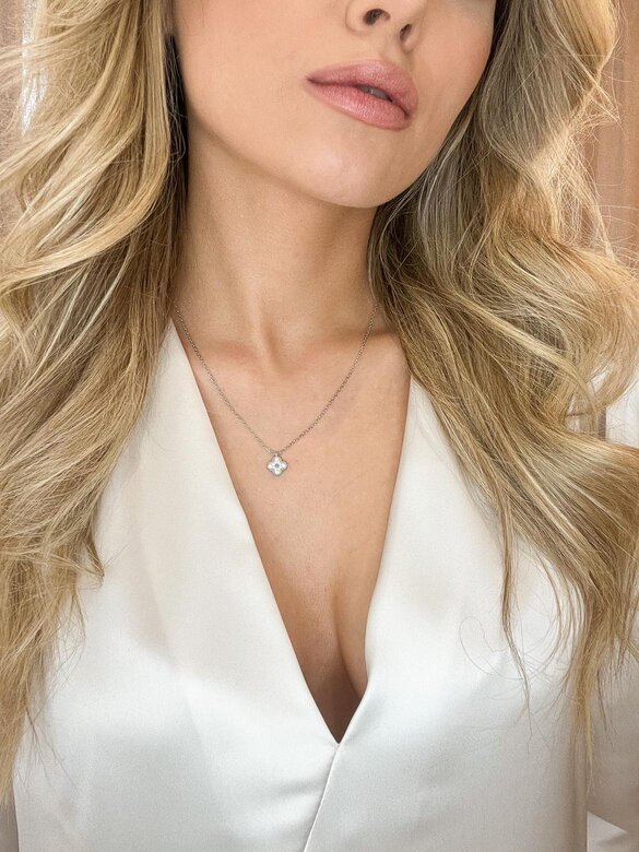 Naszyjnik z małą,srebrną koniczynką wypełniony diamencikami wykonany jest ze stali chirurgicznej.