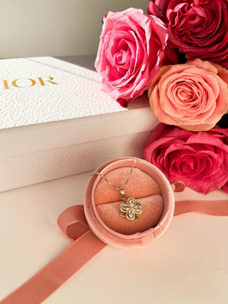 Naszyjnik ze stali chirurgicznej z diamentowym kwiatkiem umiejscowionym na większym złotym.