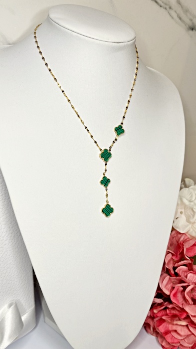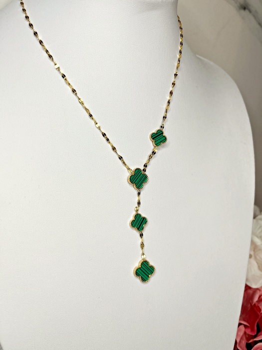 Naszyjnik ze stali chirurgicznej z zielonymi,łączonymi koniczynkami wykonany jest ze stali chirurgicznej koloru złotego.