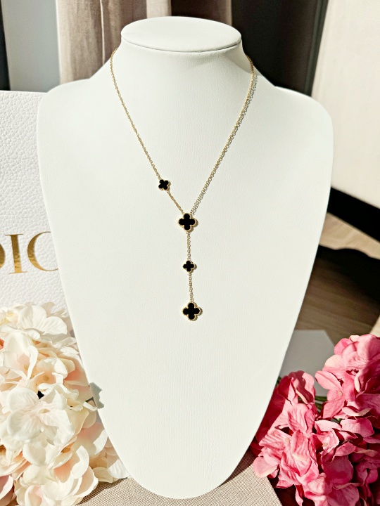 Naszyjnik z wiszącymi,pojedynczymi koniczynkami w kolorze czrnym wykonany jest ze stali chirurgicznej.