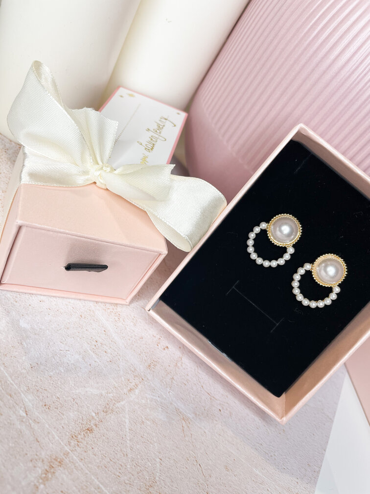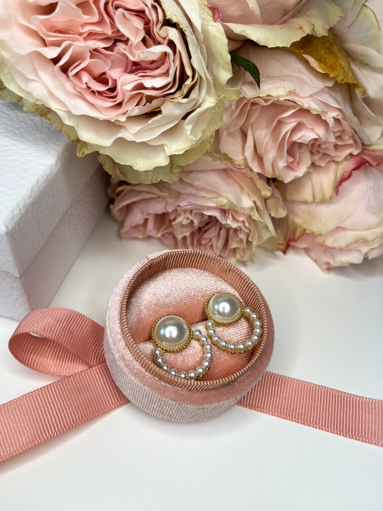 Okrągłe kolczyki otoczone drobnymi perełkami.