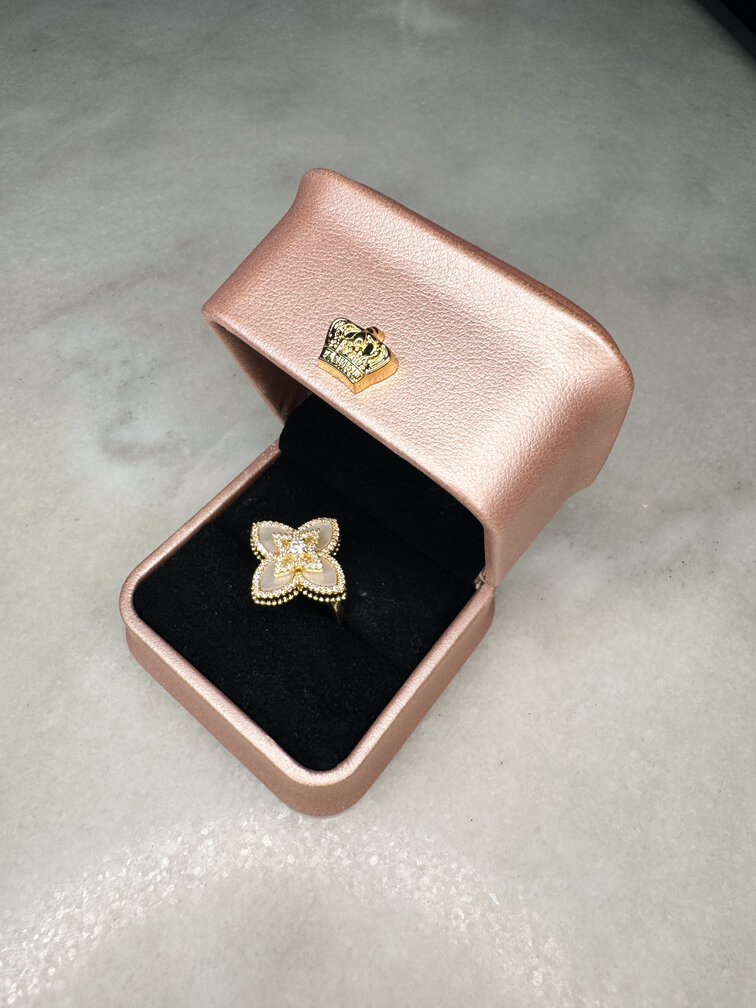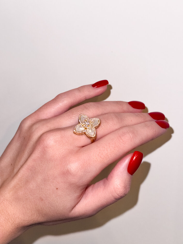 Pierścionek w kształcie kwiata otoczony jest diamencikami oraz jest wypełniony masą perłową.