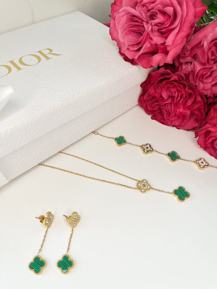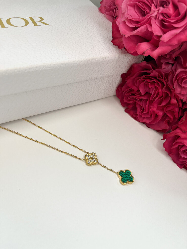 Zielony naszyjnik z koniczynką i diamencikami wykonany jest ze stali chirurgicznej w kolorze złotym.