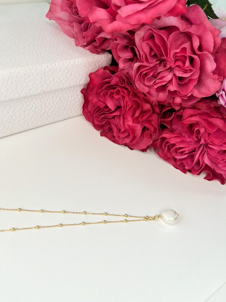 Złoty naszyjnik z nieregularną perłą wykonany jest ze stali chirurgicznej.
